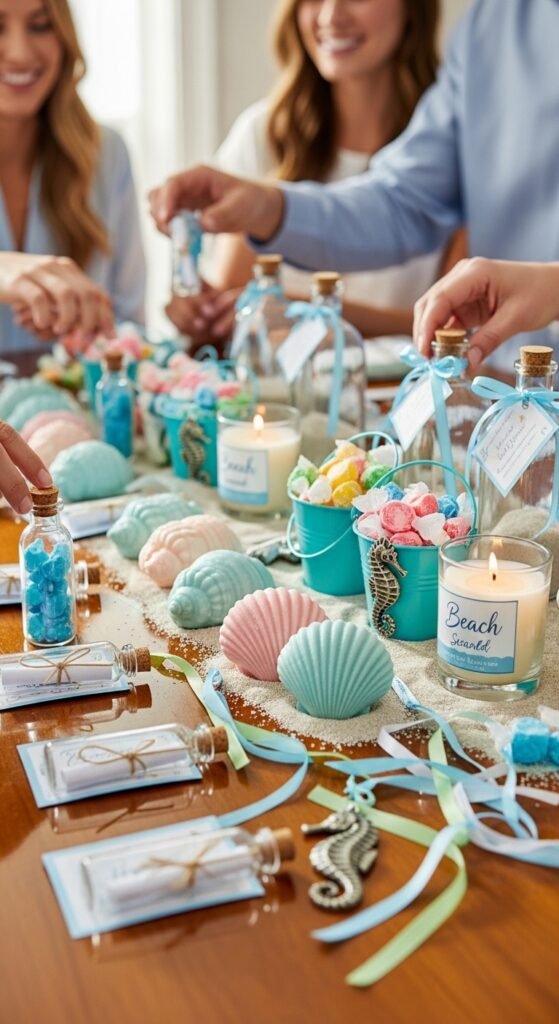 Consider personalized ocean keepsakes like mini message-in-a-bottle cards with the baby’s due date, or custom seashell soaps wrapped in nautical ribbon. Custom beach themed favors such as miniature sand buckets filled with saltwater taffy work beautifully too.