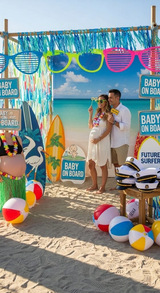 Your creative photo booth props should include inflatable beach balls, sailor hats, and “Baby on Board” signs with nautical fonts. Set up a simple backdrop using blue streamers or a beach scene poster.
