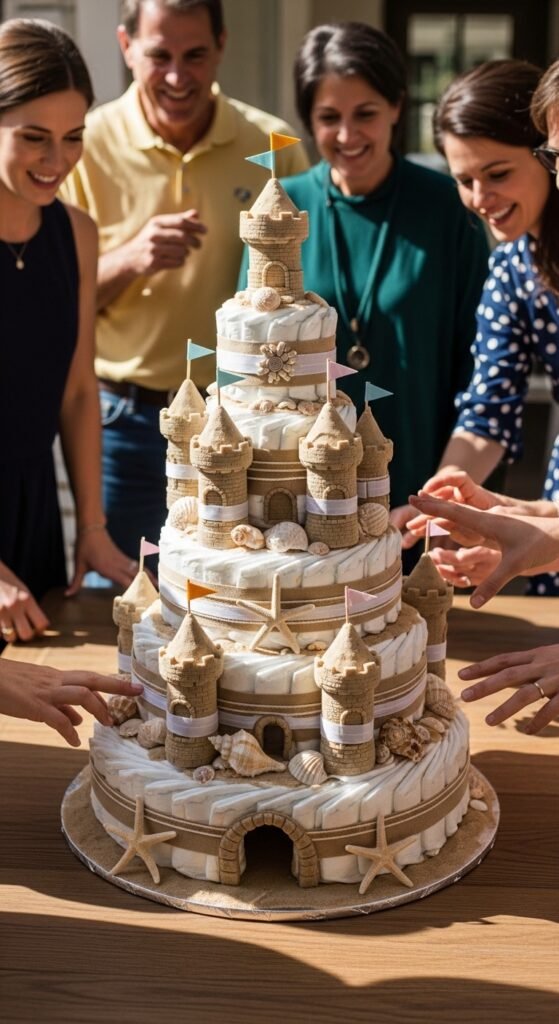 Add turrets by wrapping single diapers in beach-colored ribbon. Top with tiny flags, seashells, and starfish for authenticity. Pro tip: use size 2 or 3 diapers—they’re more useful than newborn sizes that babies quickly outgrow.
