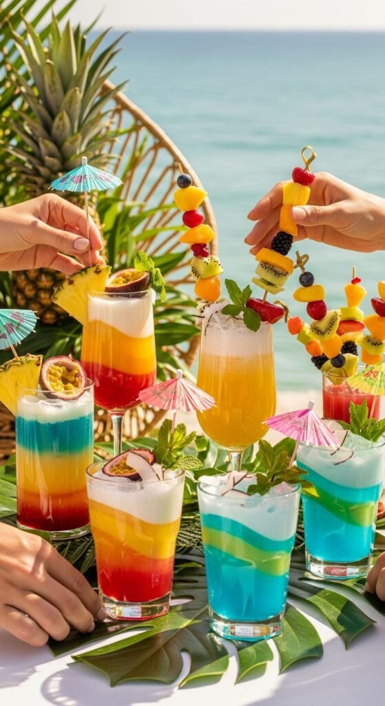 Set up customizable garnishes including paper umbrellas, fresh mint, coconut flakes, and colorful fruit skewers. This interactive element lets guests personalize their drinks while adding Instagram-worthy appeal.