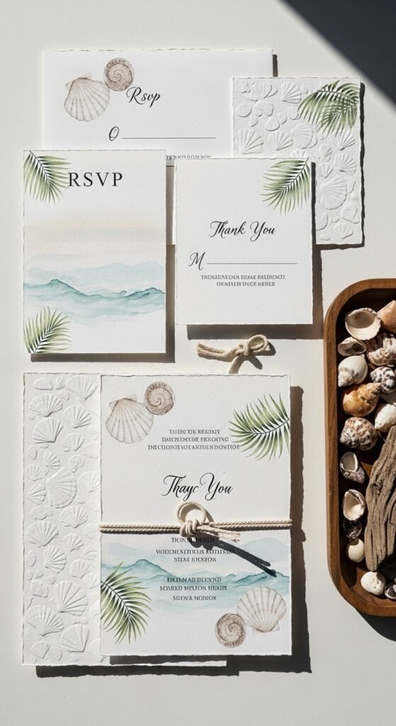 If you choose sophisticated nautical stationery, stick with navy blues, coral pinks, and sandy beiges. Include matching RSVP cards, thank you notes, and menu cards. Pro tip: add texture with embossed shells or rope details for that authentic seaside feel.