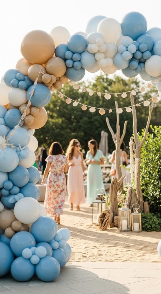 Don’t stop there. Complement your balloon arrangements with seashell garland decor woven throughout. The combination creates layers of texture that’ll make guests feel like they’ve stepped into a seaside paradise before they even enter.