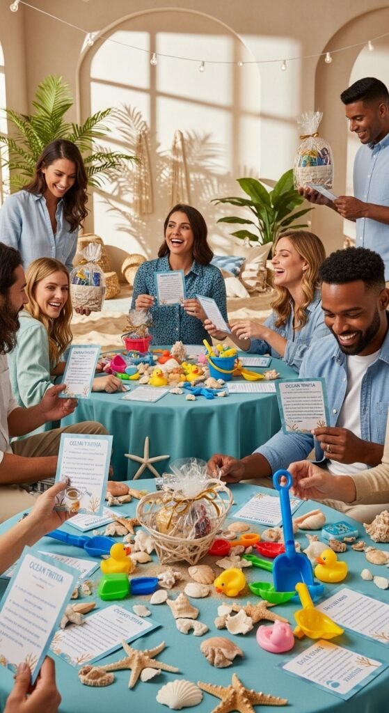 Play beach trivia featuring ocean animal facts mixed with baby-related questions. I’ve seen guests genuinely excited learning that seahorse dads carry the babies—perfect for your theme! Create categories like “Sea Creatures & Baby Features” or “Ocean Facts & Parenting Acts.”