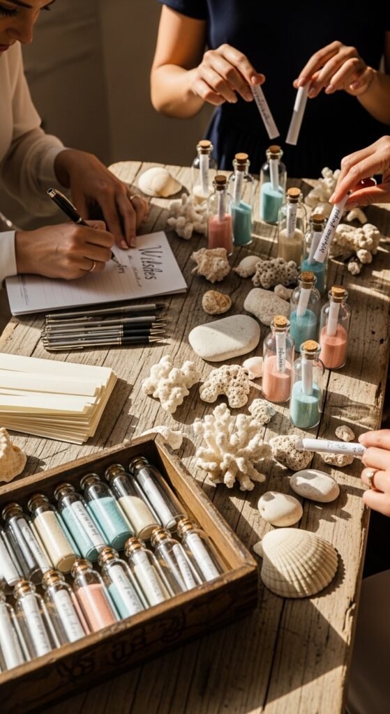 You’ll need small glass bottles, colored sand, and parchment paper strips. Place everything on a driftwood table with shells as decoration. Guests write their wishes, roll them up, and drop them into bottles filled with layered sand.