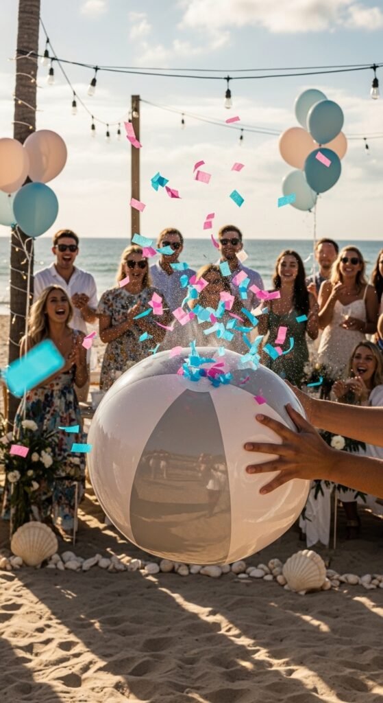 Here’s how it works: fill the beach ball with pink or blue confetti before inflating it. When you’re ready for the big moment, have someone pop it with a pin or sharp object. The colored confetti will burst out, creating an Instagram-worthy reveal that’s among the most unique gender reveal ideas you’ll find.