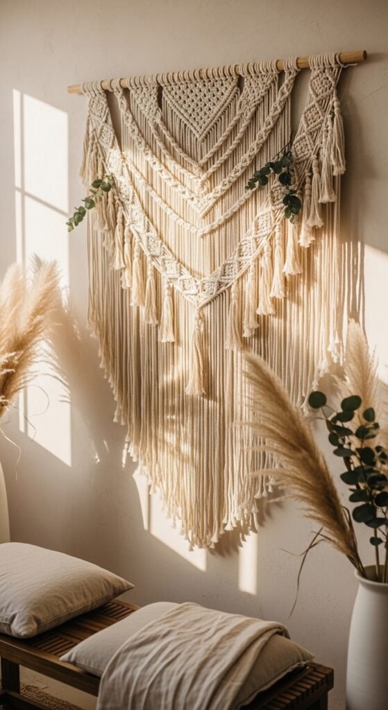 Start by hanging large macramé panels at varying heights—this creates visual depth that photographs beautifully. You’ll want to tie macramé to tree branches if you’re hosting outdoors, or use command hooks for indoor walls.
