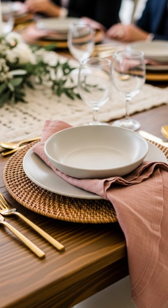 Layer these natural textures thoughtfully. Place rattan chargers first, then add your regular plates on top. The contrast creates visual depth that’s surprisingly sophisticated.
