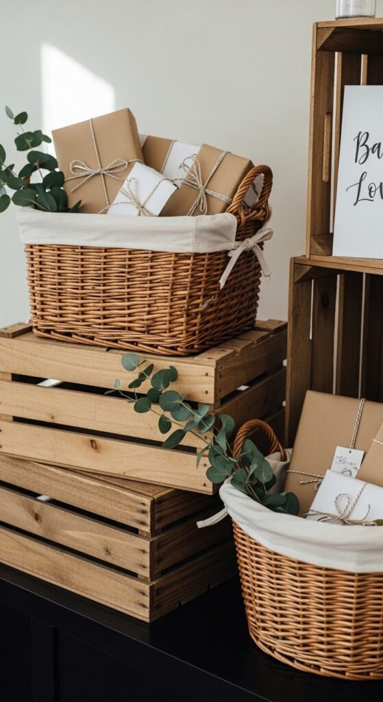 Stack different-sized crates at varying heights to create visual interest. Use natural wood crates as sturdy platforms for larger gifts, then tuck wicker baskets between levels for smaller items. This layered approach keeps everything organized while looking effortlessly styled.