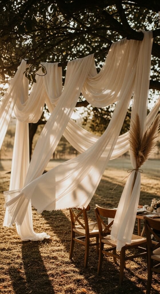 Hang fabric from beams if you’re hosting indoors – white or cream chiffon works beautifully against exposed wood. For outdoor celebrations, suspend fabric from tree branches using sturdy hooks or rope ties. I recommend choosing lightweight materials like tulle, gauze, or cotton voile that catch the breeze naturally.