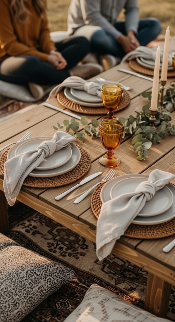 Choose linen napkins in neutral tones like dusty rose or terracotta. They’re forgiving with wrinkles, which actually adds to that relaxed boho vibe you’re after.