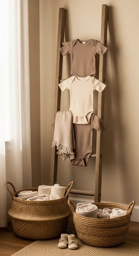 Display Baby Clothes on Woven Baskets and Vintage Ladders