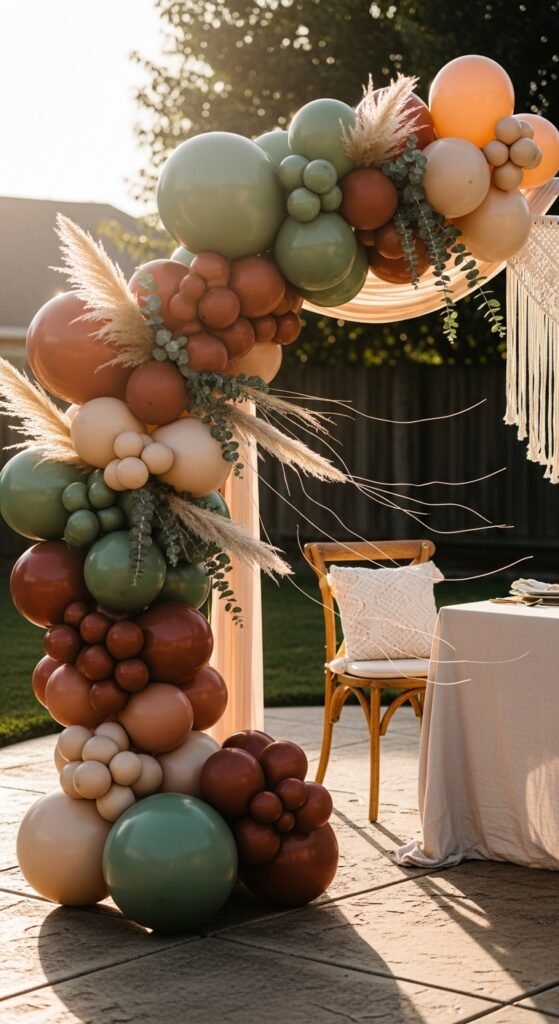 Start with a balloon strip or fishing line as your base. Mix different balloon sizes for visual interest, clustering similar tones together. Here’s where you’ll incorporate natural textures: weave dried pampas grass, eucalyptus stems, or macramé cord throughout your arch. The organic elements soften the balloons’ artificial look, creating that effortless boho vibe you’re after.
