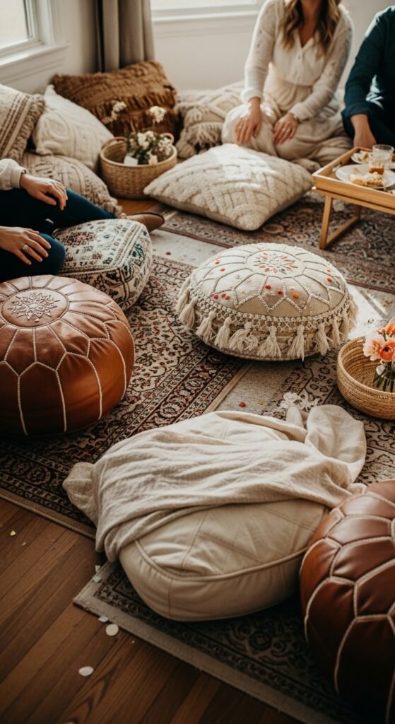 Layer vintage Persian rugs with Moroccan floor pillows and embroidered poufs to establish your cozy floor seating arrangement. Mix textures—think velvet cushions against jute rugs—for visual depth.