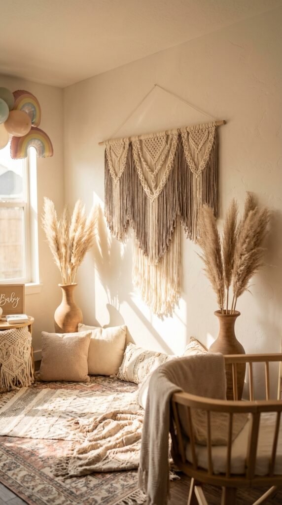 Start with a large macramé wall hanging as your centerpiece—I love the cascading patterns that create movement and texture. Frame it with tall pampas grass stems in neutral ceramic vases. The feathery plumes add softness while keeping focus on your colorful rainbow elements.