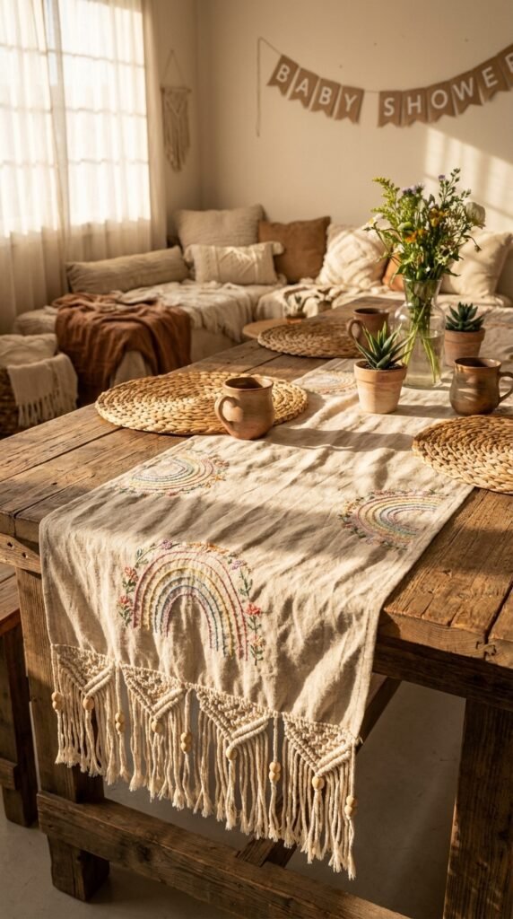 Natural fiber table runners bring earthy texture and handmade charm to your boho rainbow baby shower tablescape. Choose linen or burlap as your base, then create colorful embroidery patterns using rainbow thread. Simple running stitches work beautifully—even beginners can become proficient in this technique in an afternoon.