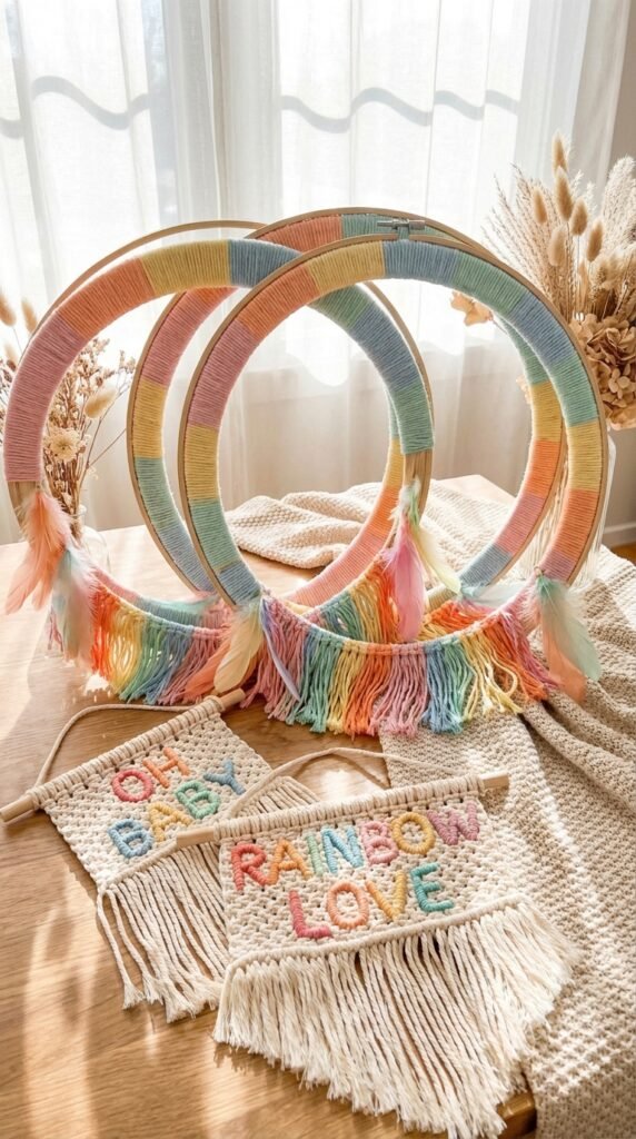 Create handheld props like macramé signs saying “Baby Loading” or “Almost There!” with rainbow tassels dangling below. Don’t forget fringe embellished decor—think rainbow-colored fringe garlands or feathered headbands for guests to wear. These props photograph beautifully and give everyone something fun to pose with during the celebration.