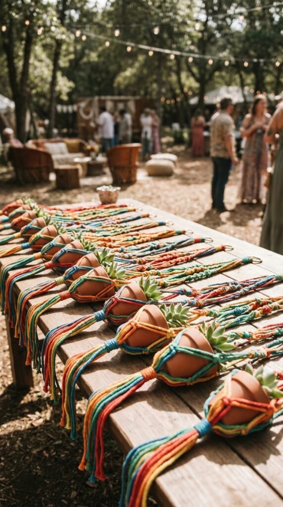 Rainbow macramé plant hangers make perfect party favors that blend practicality with boho style. You’ll need rainbow cotton cord and basic macramé techniques like square knots and spiral patterns. Start with simple designs—even beginners can command these in under an hour.