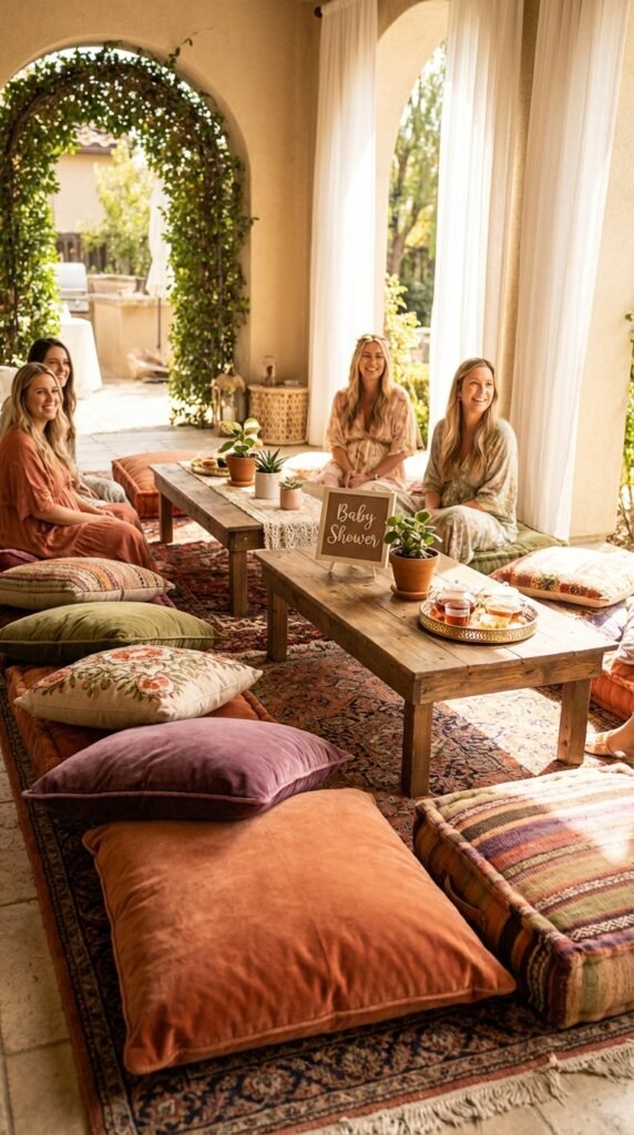 Arrange your cozy lounge seating around low coffee tables or vintage rugs. Don’t forget floor pillows for back support – trust me, your pregnant guests will thank you later for this thoughtful touch.