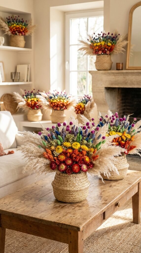 I’ve found that colorful dried flower arrangements in natural woven baskets perfectly capture that free-spirited boho vibe you’re after. Start with pampas grass as your base, then layer in dried strawflowers, celosia, and globe amaranth in rainbow shades.