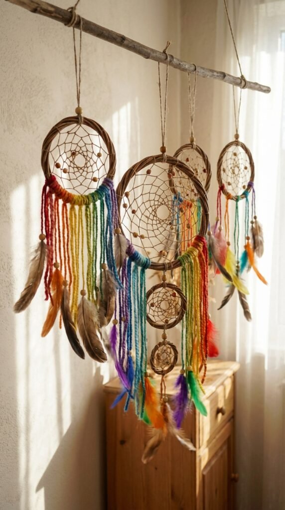 Weave your web using traditional techniques, then incorporate natural elements like wooden beads and genuine feathers. Hang these beauties at different heights using invisible fishing line. The gentle movement creates an enchanting atmosphere that’s pure boho magic.