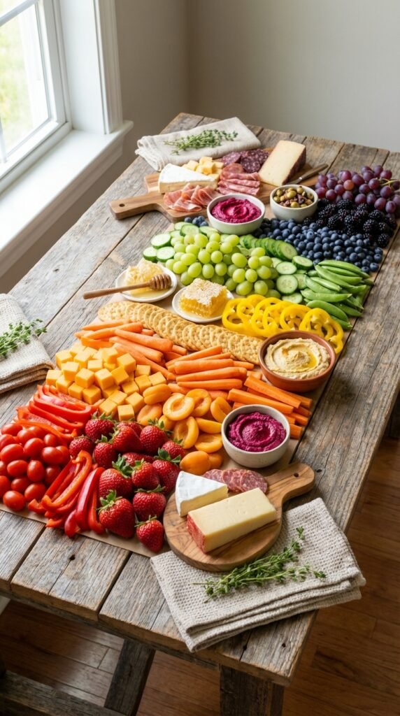 Transform rustic wooden cutting boards into colorful masterpieces by arranging foods by hue. Picture vibrant cherry tomatoes, orange cheddar cubes, golden crackers, and fresh berries creating stunning rainbow rows. The natural wood textures provide perfect contrast against these vivid color combinations.