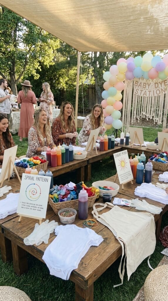 The tie-dye onesie station brings hands-on creativity to your boho rainbow celebration—and trust me, it’s the activity that’ll have everyone from grandmas to best friends giggling like kids.