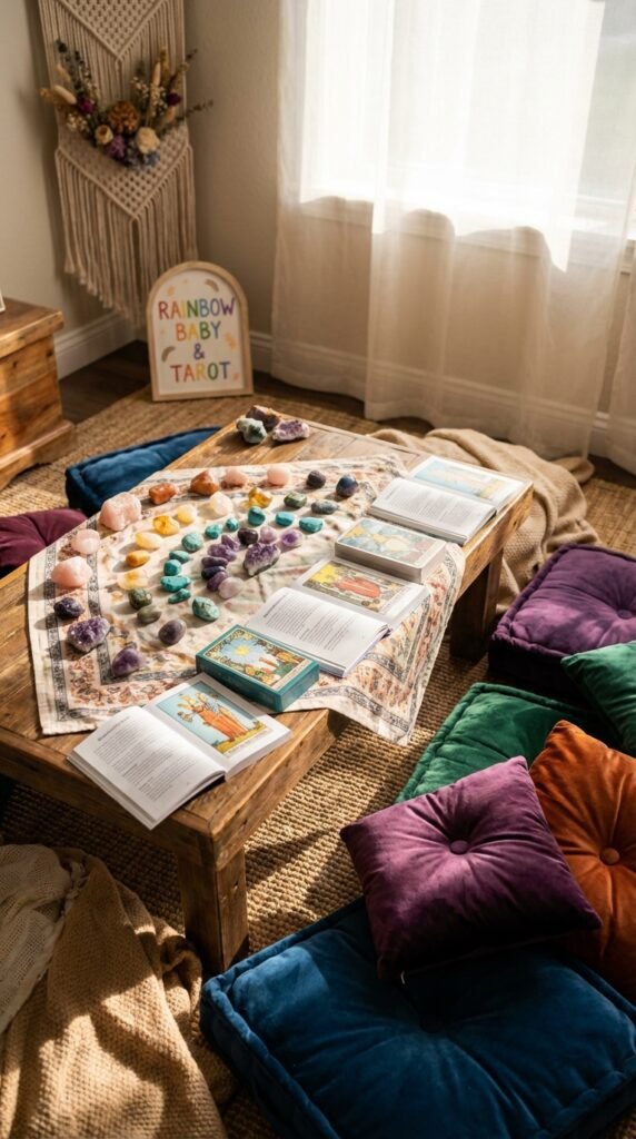 Since mystical elements perfectly complement the free-spirited boho aesthetic, creating an interactive crystal and tarot corner adds meaningful depth to your rainbow baby shower celebration.