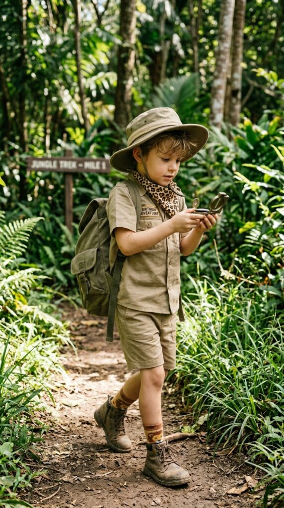 Once you’ve got the invitations sorted, dressing the birthday boy is honestly one of the most fun parts of the whole planning process. Grab a classic khaki shirt, matching shorts, and a wide-brimmed hat — that’s your foundation.