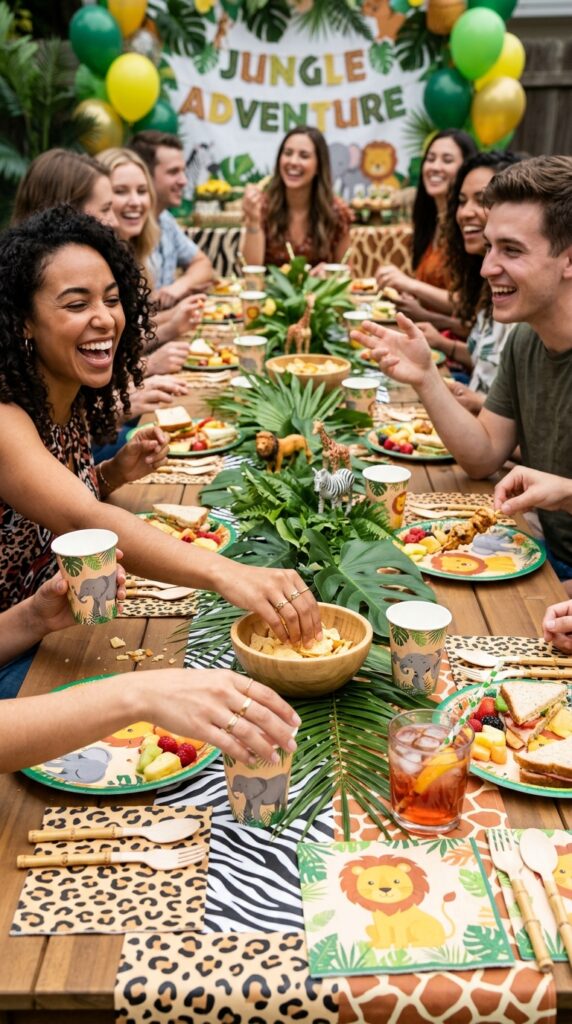 Don’t overlook the little extras: animal-print tablecloths, bamboo-style utensils, and safari-themed centerpieces pull everything together beautifully. A well-styled jungle-inspired table setting can serve as a stunning focal point that ties your entire safari theme together.