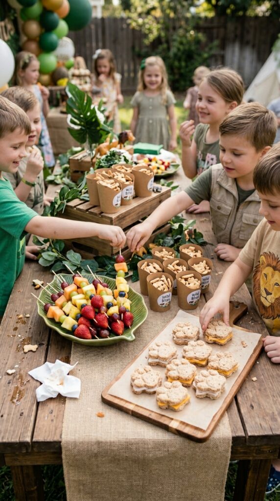Now that the cake is sorted, let’s talk about the food that’ll keep little explorers fueled between games. Animal crackers are an obvious win — they’re safari-themed without any extra effort. Arrange them in small biodegradable cups labeled “Wild Bites” for a cute touch.