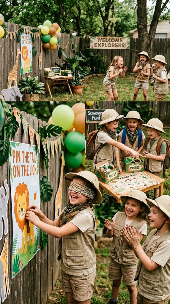 Games can make or break a party, and safari-themed options give you a natural advantage — the theme practically does the work for you. “Pin the Tail on the Lion” is a classic that needs no explanation, but you can also go wild (pun intended) with a “Animal Tracker” scavenger hunt where kids follow clue cards to find hidden plastic animals around the yard.