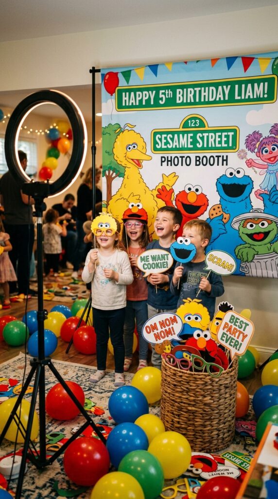 After your snack station is all set up, you’ll want a dedicated spot where guests can capture memories — and a Sesame Street photo booth delivers exactly that.