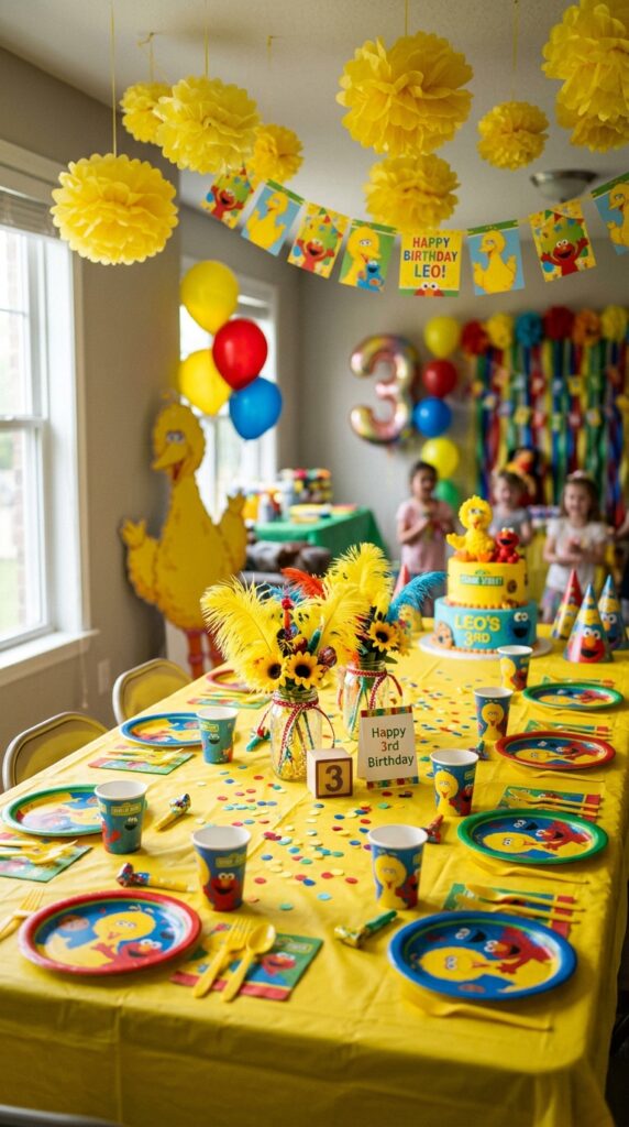 For yellow decor, use sunflower-toned tablecloths, mustard ribbon streamers, and yellow tissue pom-poms hanging overhead. Big Bird crafts like feather centerpieces and golden paper cutouts add texture without breaking the budget.