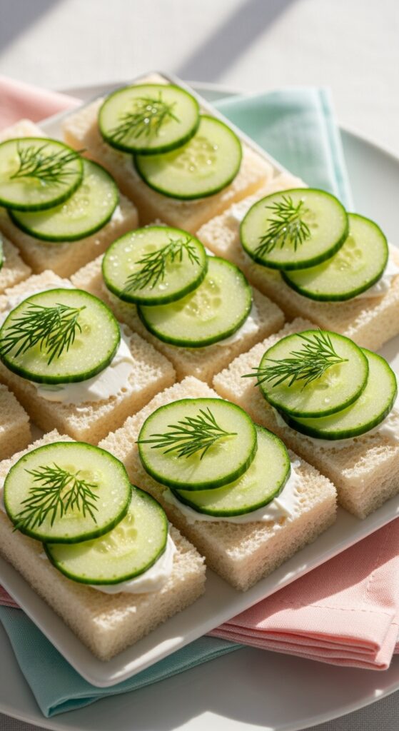 I recommend using thinly sliced English cucumbers on crustless white bread with cream cheese and fresh dill. The key? Salt your cucumber slices for fifteen minutes, then pat dry—this prevents soggy sandwiches that’ll fall apart.