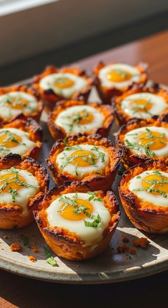 You’ll create these beauties by pressing seasoned sweet potato hash into muffin tins, then baking until crispy. Crack an egg into each cup during the final minutes for that gorgeous runny yolk.