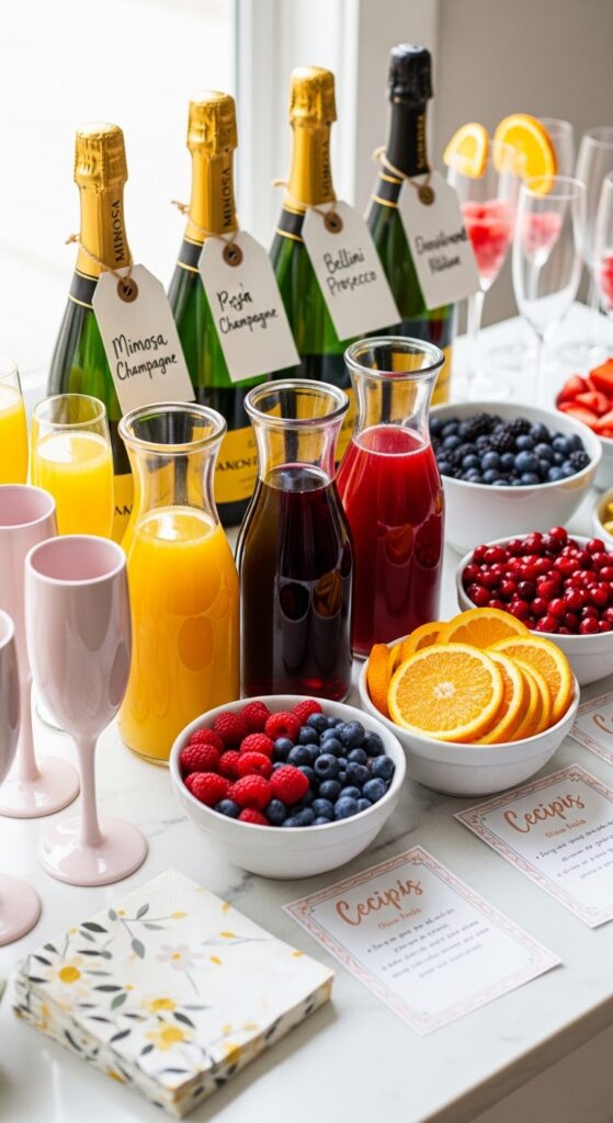 Set up labeled bottles alongside an array of juice varieties: classic orange, peach nectar, cranberry, and pomegranate. I always include fresh berries and orange slices for gorgeous garnishes that photograph beautifully.