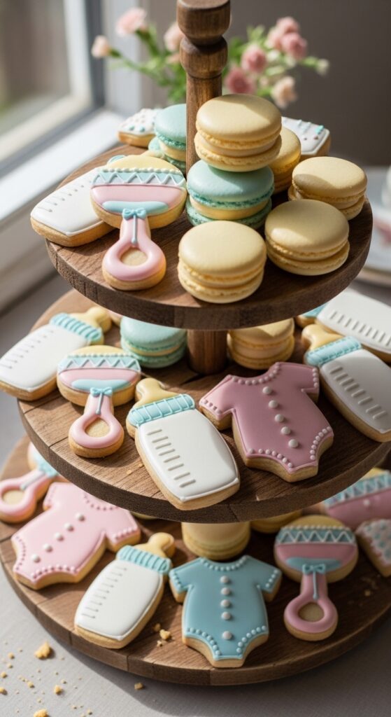 For intricate cookie cutouts, think baby bottles, rattles, and tiny onesies decorated with royal icing. I’ve found that ordering from local bakeries guarantees professional-looking results without the stress.