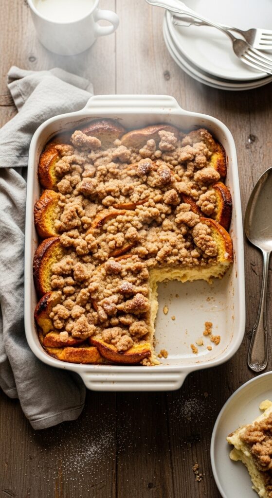 You’ll prep this the night before, letting thick bread slices soak up a rich egg mixture until they reach that perfect custard consistency. The cinnamon streusel topping adds captivating crunch and warmth.