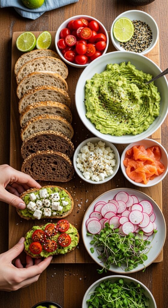 Start with different bread options—sourdough, multigrain, and pumpernickel work beautifully. Mash fresh avocados with lime juice and sea salt, or offer simple guacamole recipes for variety.