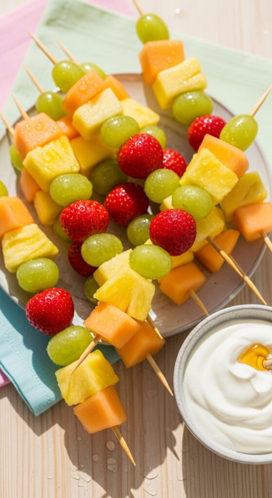 Thread strawberries, grapes, pineapple chunks, and melon balls onto wooden skewers for Instagram-worthy presentation. I always choose seasonal fruit selection to maximize flavor—think peaches in summer or citrus in winter.