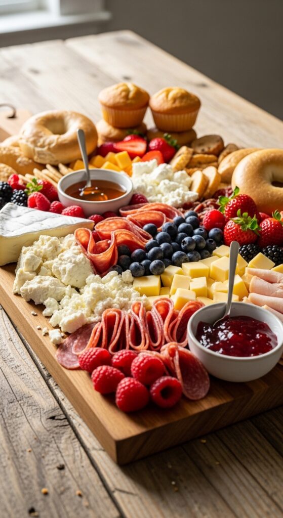 Include small bowls of jam, honey, and cream cheese for spreading. Arrange everything on a large wooden board, creating height with small dishes and letting colors flow naturally together.