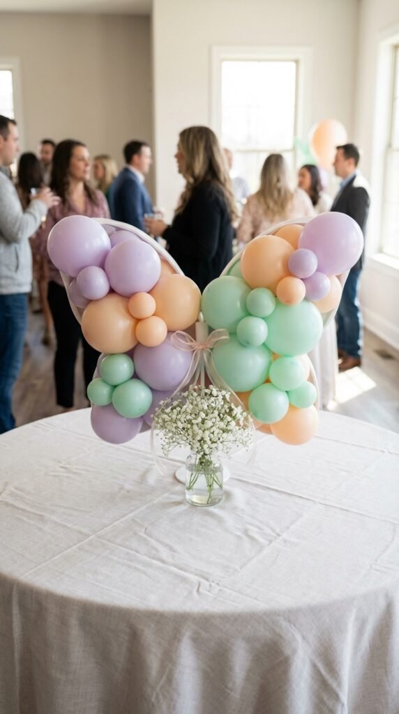Arranging five to seven balloons per wing works perfectly – any more looks cluttered. Secure balloon butterfly bouquets with weighted ribbon tied to small glass vases filled with baby’s breath. The key is varying balloon sizes within each cluster to mimic natural wing patterns. Your guests will be amazed by these fanciful, budget-friendly showstoppers.