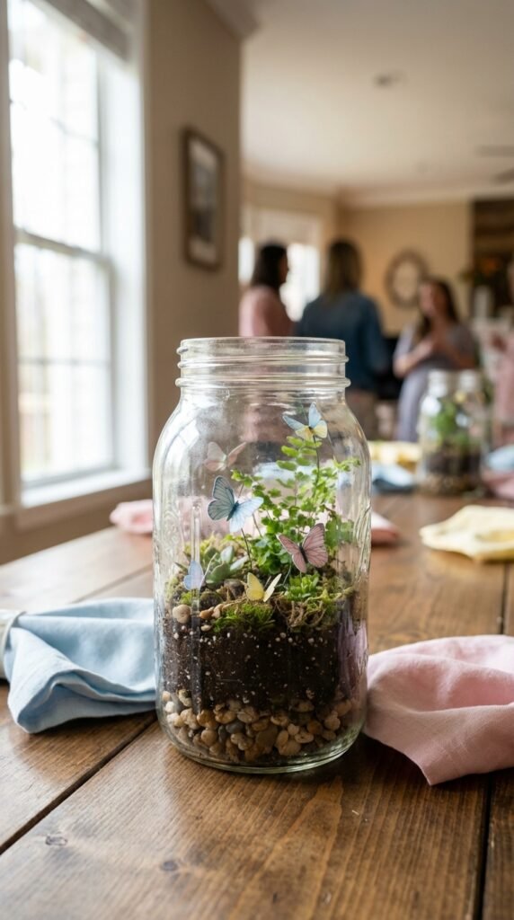 Creating your own miniature butterfly gardens inside mason jars brings an absolutely magical touch to your baby shower tables—and honestly, they’re so adorable your guests will be begging to take them home as favors.