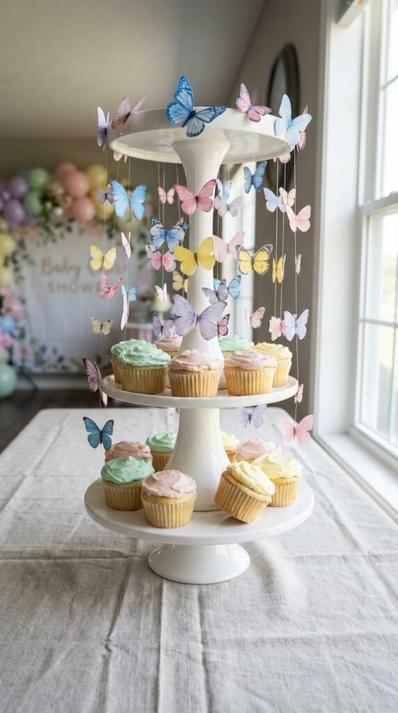 Attach whimsical butterfly sculptures using thin fishing line at varying heights. Place larger butterflies on upper tiers, smaller ones cascading downward. Fill each level with coordinating treats, flowers, or baby items. The movement creates stunning visual flow that guests can’t resist photographing.
