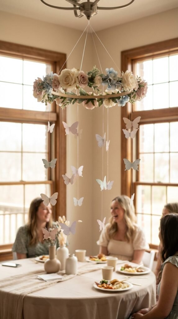 I recommend using embroidery hoops wrapped in silk flowers, then attaching paper or fabric butterflies at varying lengths. Suspended butterfly lanterns add magical lighting – especially beautiful for evening showers. Position them about six feet above tables so guests can still converse comfortably.