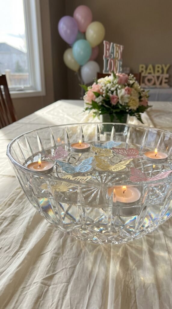 For dramatic impact, try tiered floating candle stands with butterflies perched along the edges. The multi-level display draws eyes upward while casting gorgeous shadows. Pro tip: use battery-operated floating candles if you’re worried about safety—they look surprisingly realistic and won’t accidentally singe delicate butterfly wings.