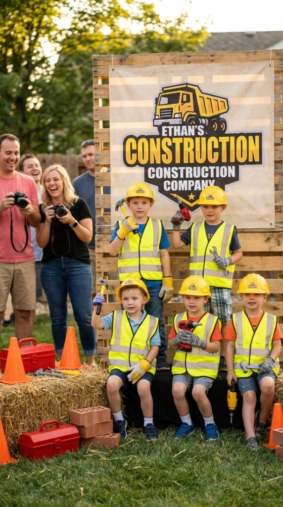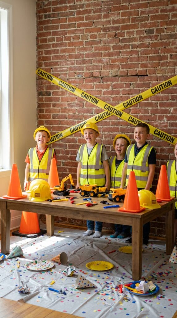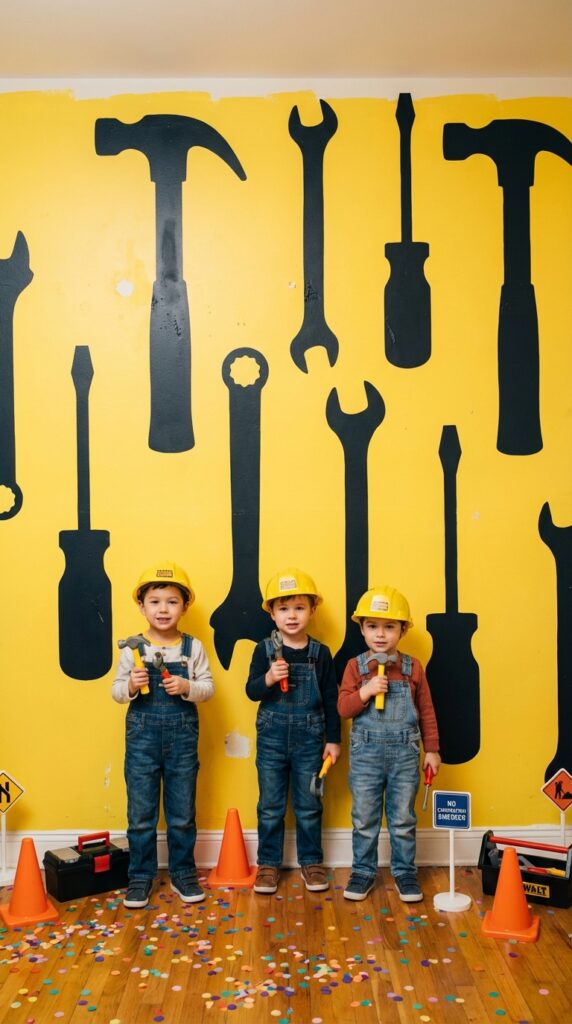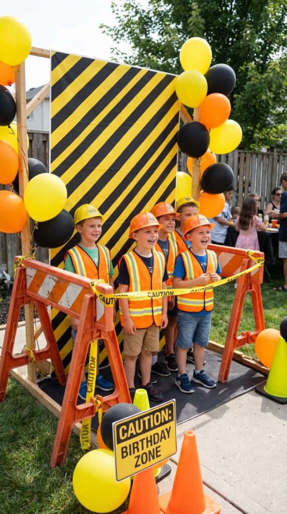 String the caution tape diagonally across your backdrop or create a crisscross pattern. It photographs beautifully and screams “construction zone!” Trust me, kids absolutely love posing behind it like they’re on a real worksite.