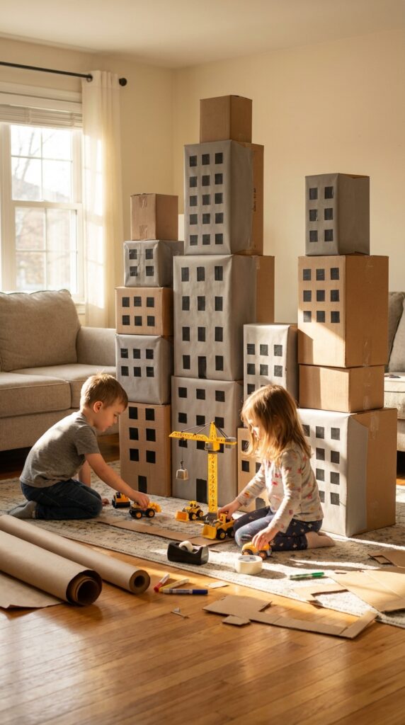 Stack various-sized boxes to create different building heights, then cover them with gray or silver paper. Add black electrical tape for windows—simple yet effective. These cardboard construction techniques work beautifully for scale model ideas without breaking the bank.
