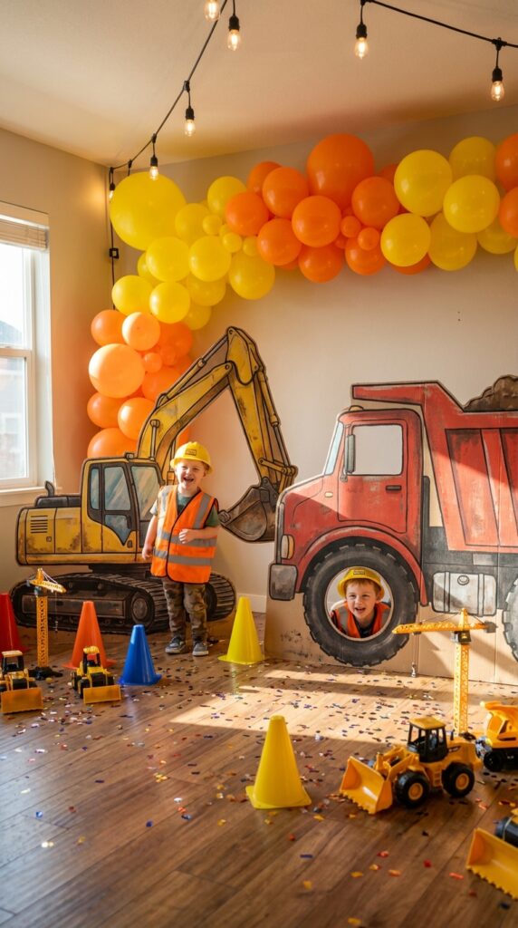 Your backdrop needs a star attraction, and nothing captures kids’ imaginations quite like larger-than-life construction vehicles they can pose with. Create a heavy machinery photo op by positioning cardboard excavator and dump truck cutouts around your party space. You’ll want these at least four feet tall so kids can stand beside them for scale.
