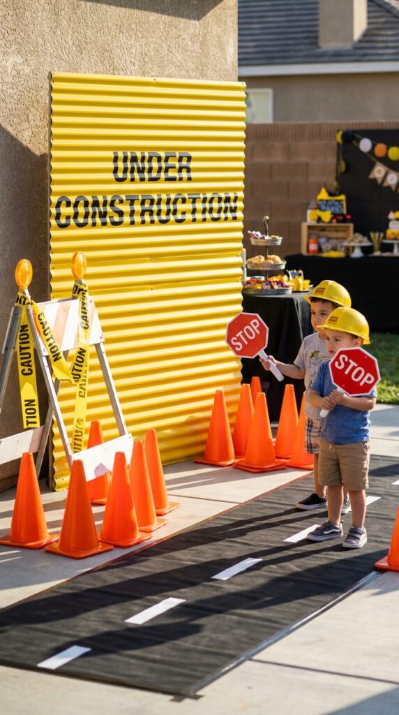 Bright yellow “Under Construction” signs immediately signal to party guests that they’ve entered a legitimate work zone. You’ll want to position oversized caution signs as your backdrop’s centerpiece, then flank them with orange traffic cones for authentic dimension.